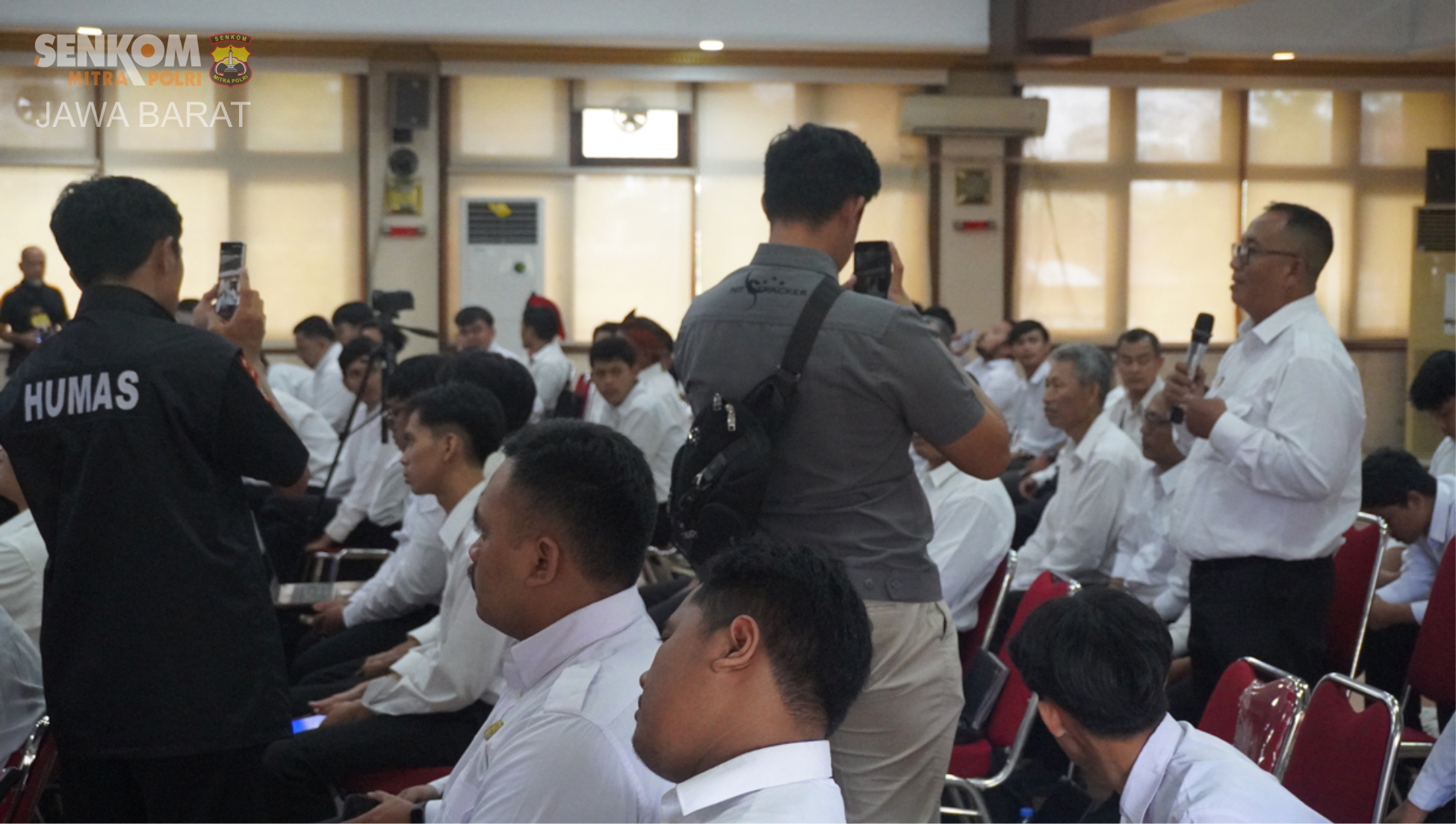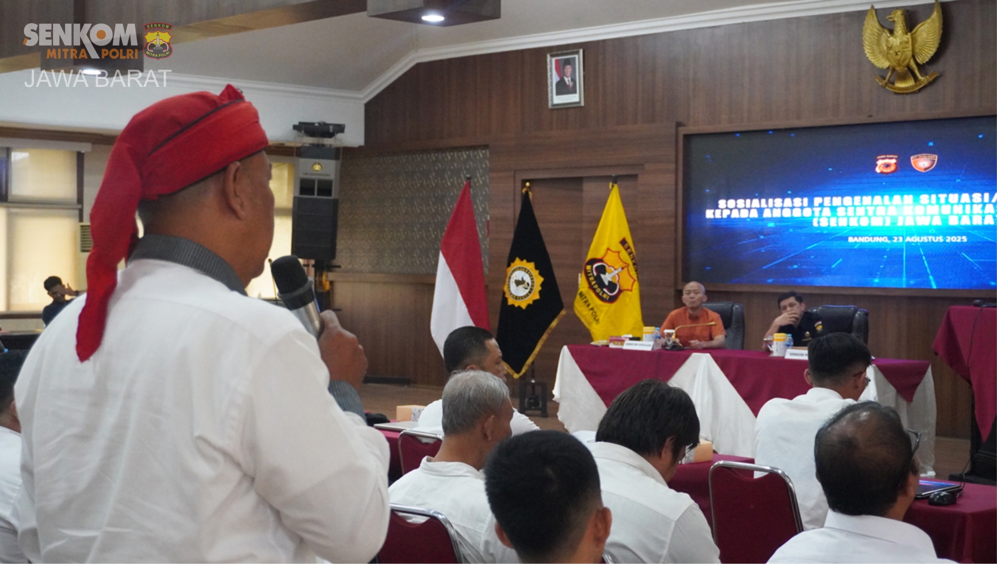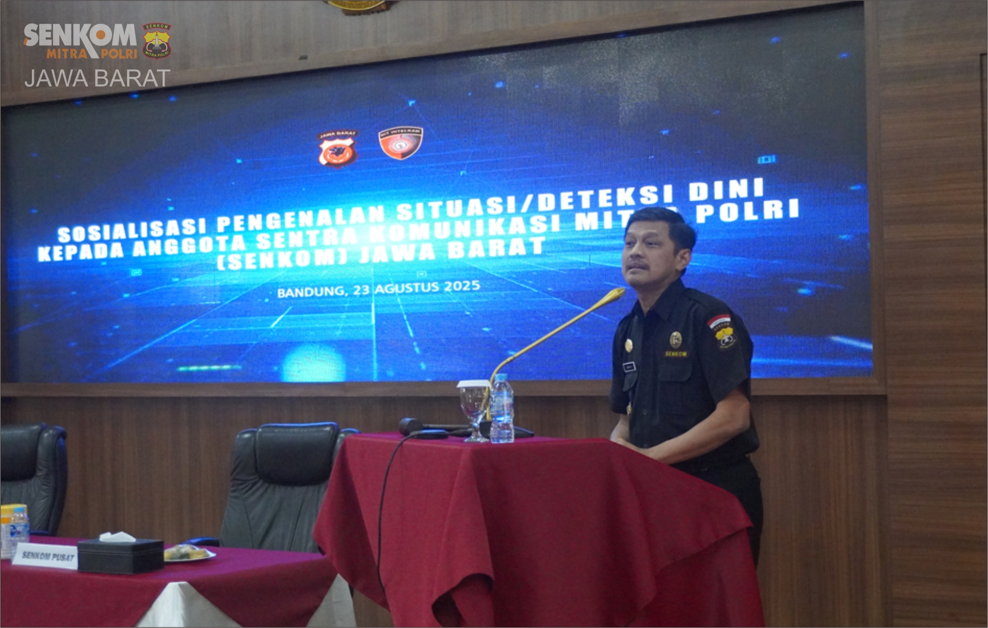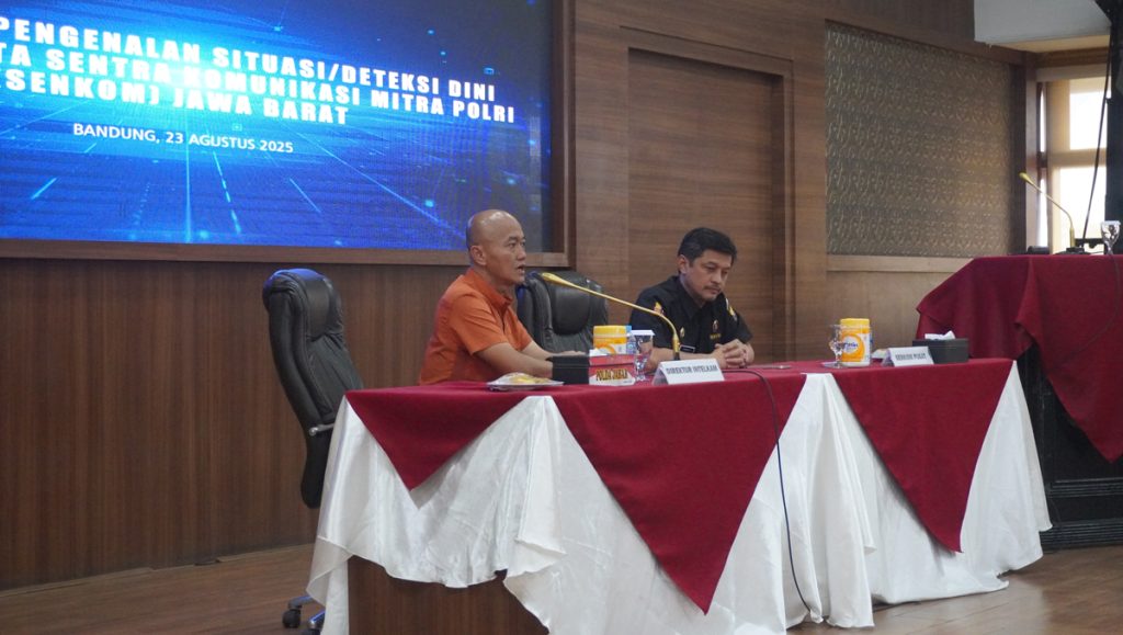 Bertempat di Aula Muryono Mapolda Jabar, kegiatan Sosialisasi Pengenalan Situasi/Deteksi Dini kepada anggota Senkom Jawa Barat digelar pada Sabtu, 23 Agustus 2025, pukul 09.00–12.00 WIB.